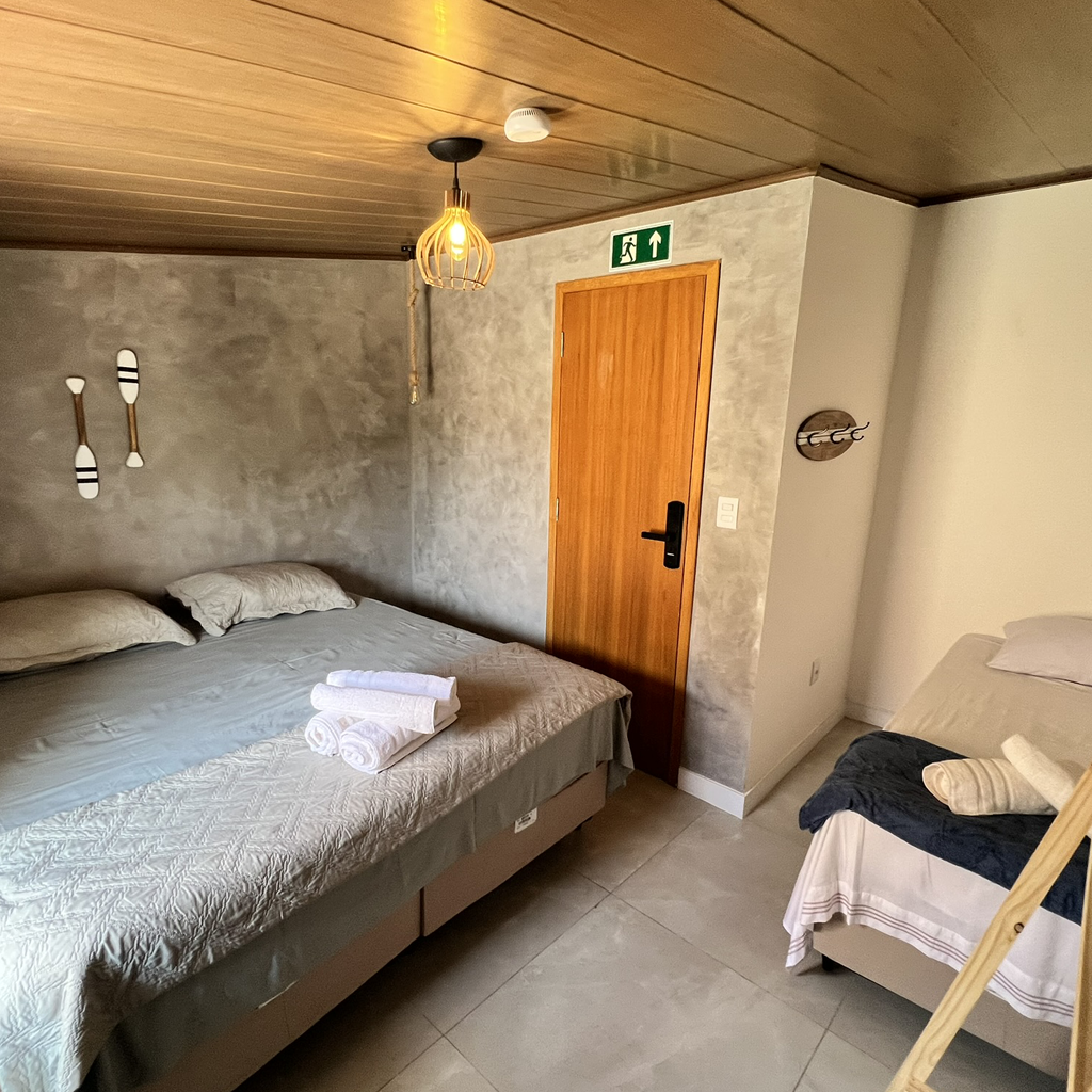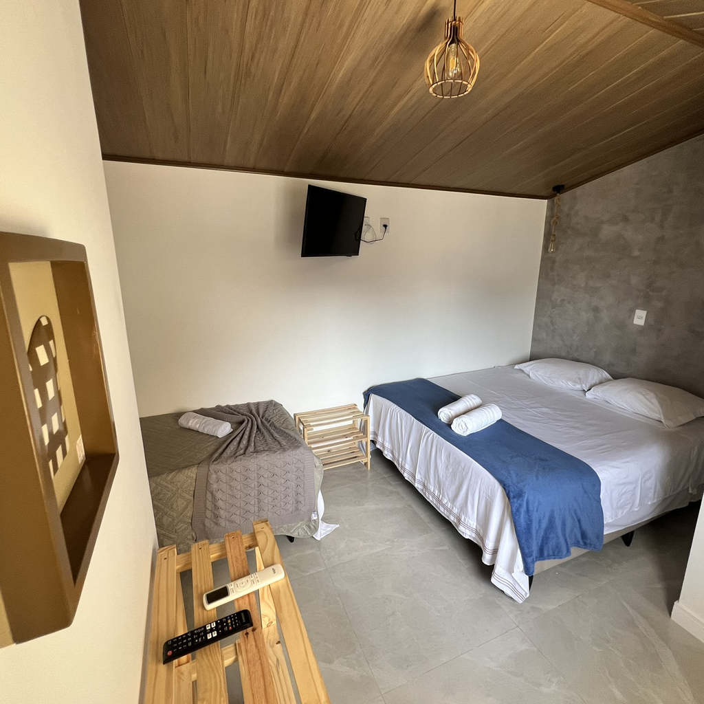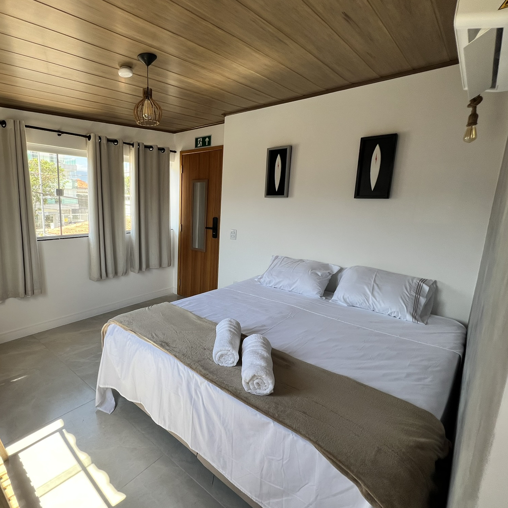 Nossa opção mais espaçosa para grupos. Suíte nova com configurações de até 4 ou 5 pessoas, TV, Wi-Fi, Frigobar, Ar-Condicionado e o espaço perfeito para o descanso pós praia e surf.